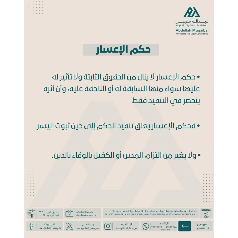 • فحكم الإعسار يعلق تنفيذ الحكم إلى حين ثبوت اليسر.